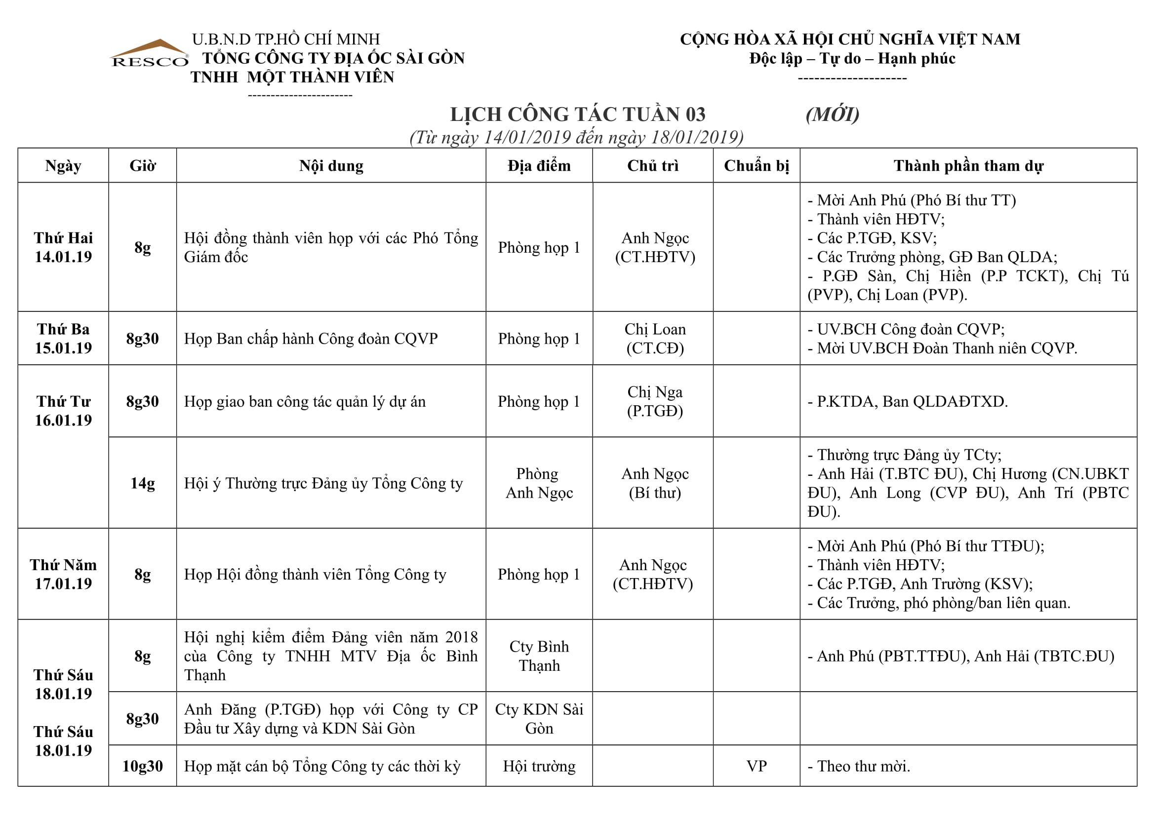 Lịch công tác tuần 03 (Từ ngày 14/01/2019 đến ngày 18/01/2019)