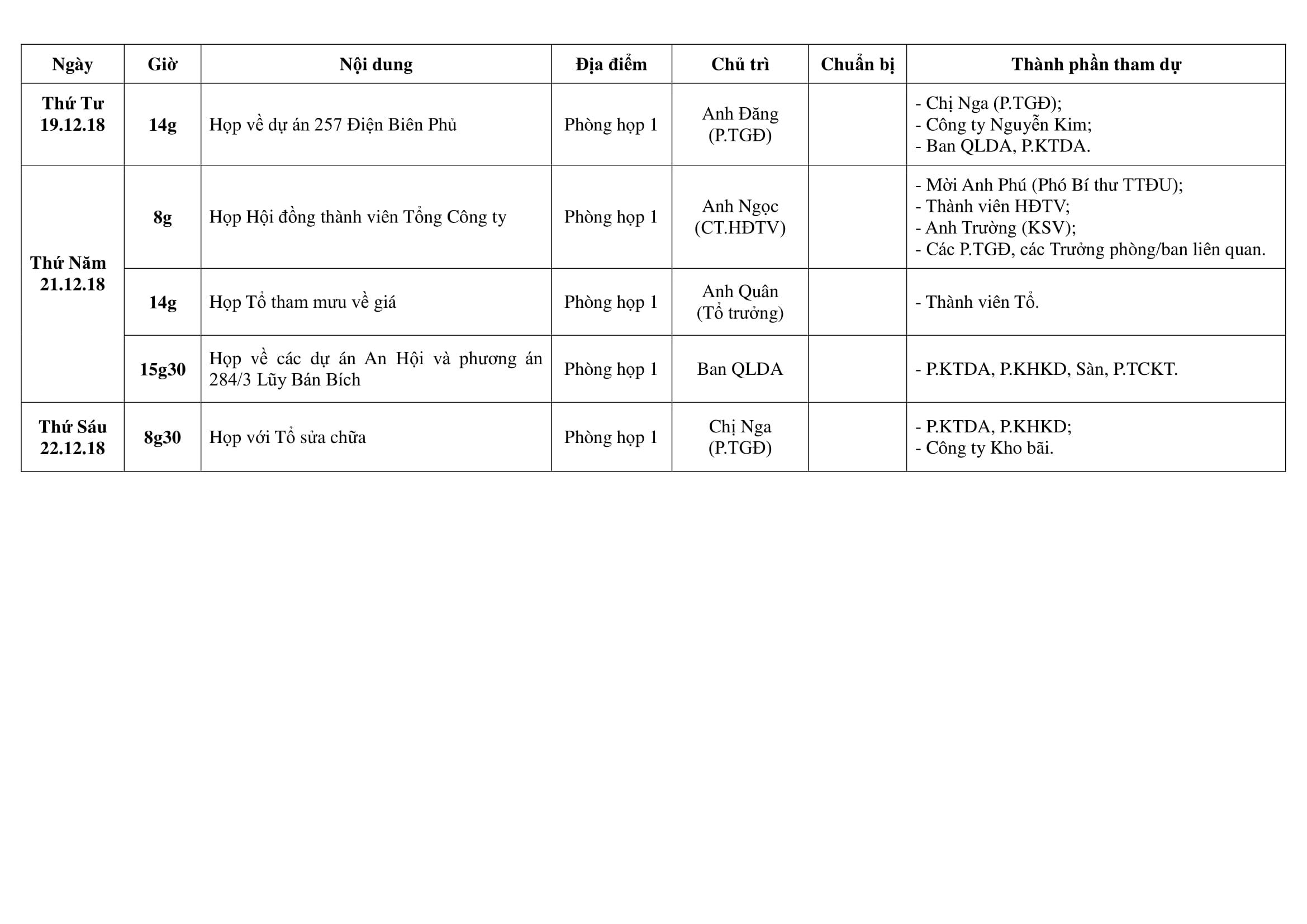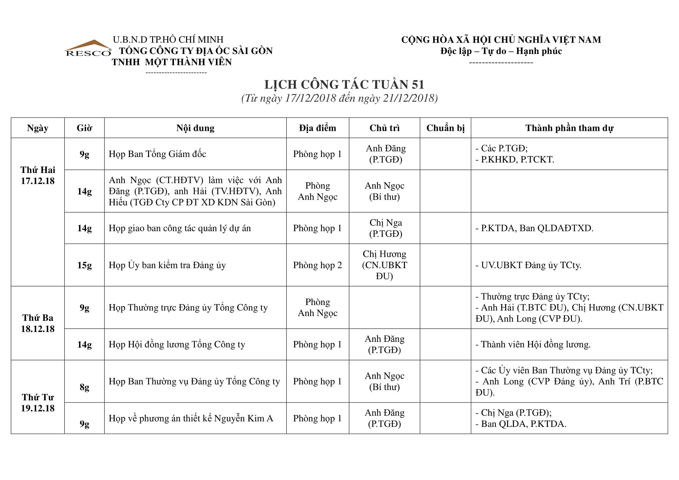 Lịch công tác tuần 51 (Từ 17/12/2018 ngày đến ngày 21/12/2018)
